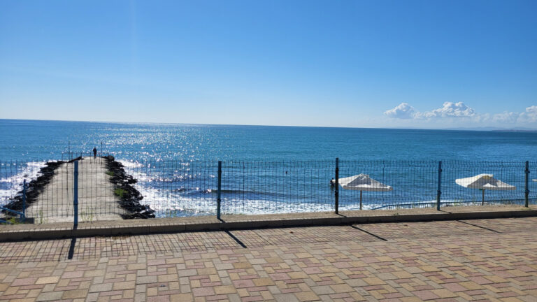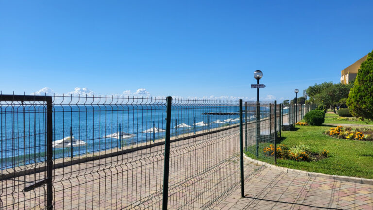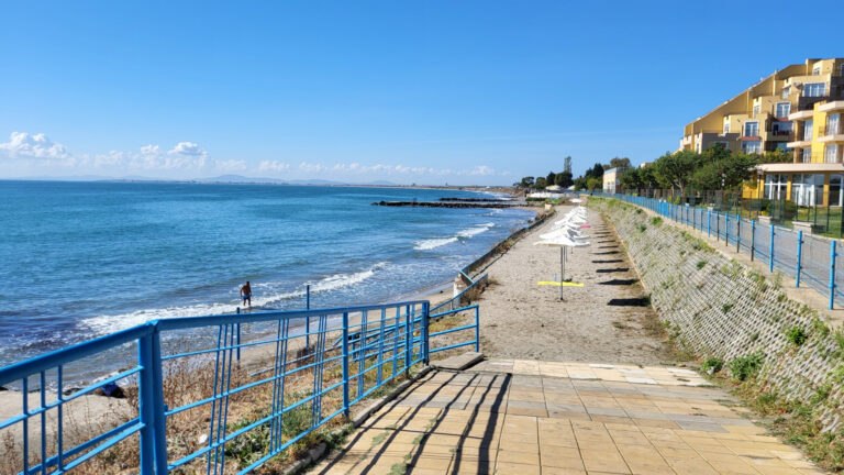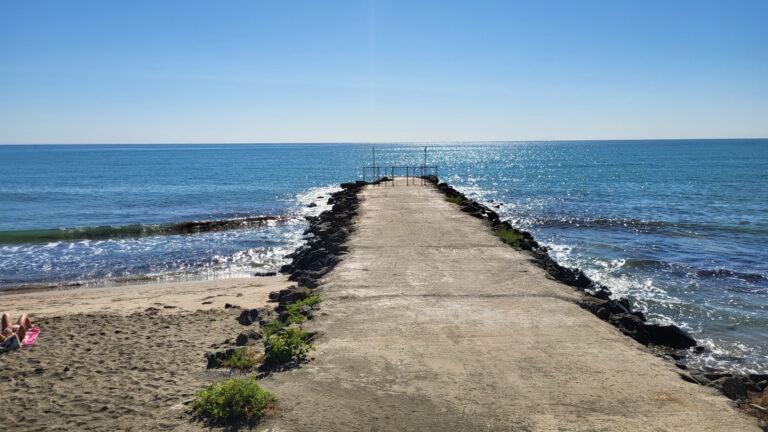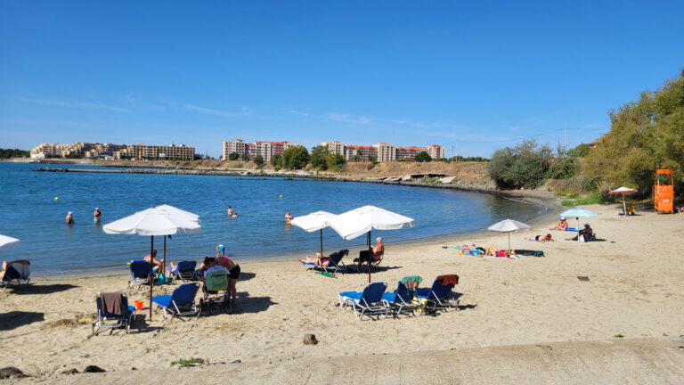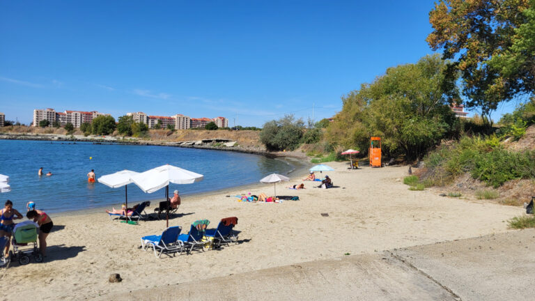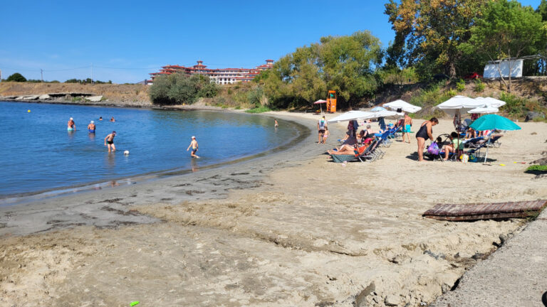 Resort se nachází jen přibližně 20 metrů od moře. Po krátké procházce dojdete k molu, odkud se vpravo nachází první pláž. Tato pláž je unikátní svou rozdělenou strukturou. První, úzká linie přímo u moře je ideální pro ty, kteří preferují ležení v těsné blízkosti vody. Pro pohodlnější odpočinek je pak asi o 3 metry dál (cca 10 schodů) druhá linie vybavená slunečníky, které jsou zdarma k dispozici.
